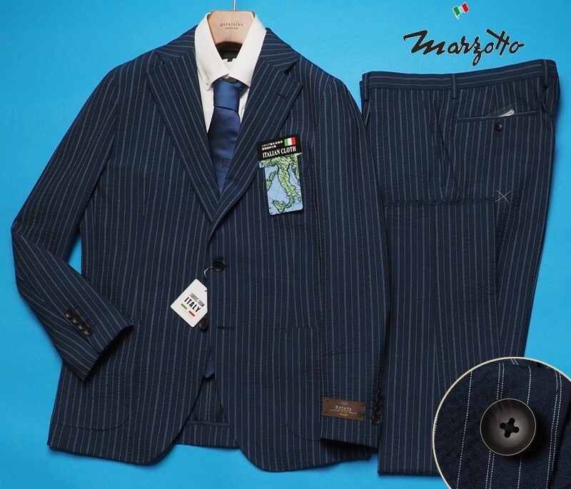 - 新品8.6万円 大手百貨店扱い 春夏『MARZOTTO マルゾット 伊製生地』シアサッカー ストライプ セットアップ スーツAB7青紺(F) 1636091