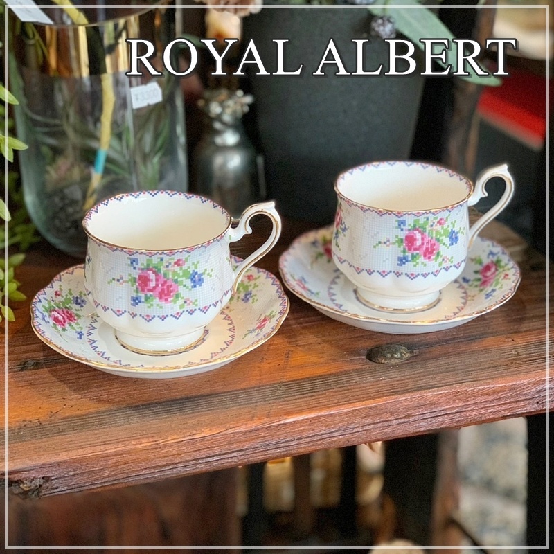 - 【福岡】ROYAL ALBERT ロイヤルアルバート プチポワン Petit Point カップ&ソーサー 2客セット 金彩 ボーンチャイナ 廃盤【RU0223-1】