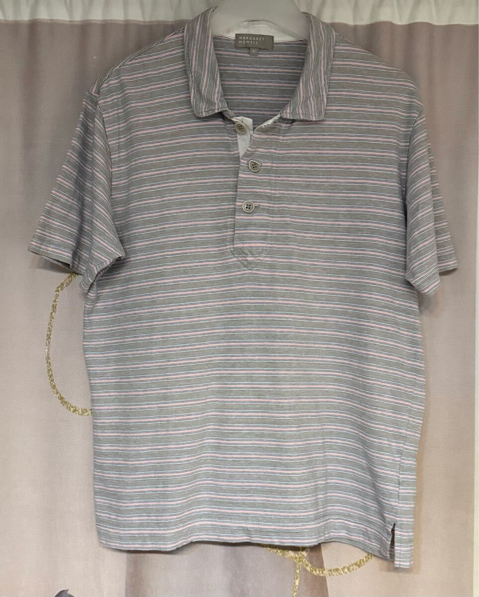 - マーガレットハウエル ビッグボタン コットンリネン ボーダー ポロシャツ