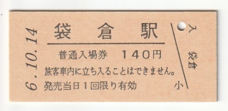 - 平成6年10月14日 吾妻線 袋倉駅 140円硬券普通入場券(日付印刷)