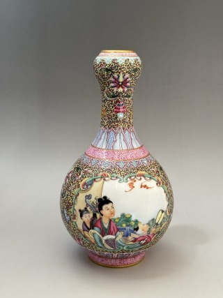 > 『三希堂』 中国磁器 [乾隆年制] 人物西番蓮纏枝蓮紋瓶 高さ18cm 口径2.6cm 底径5cm C11