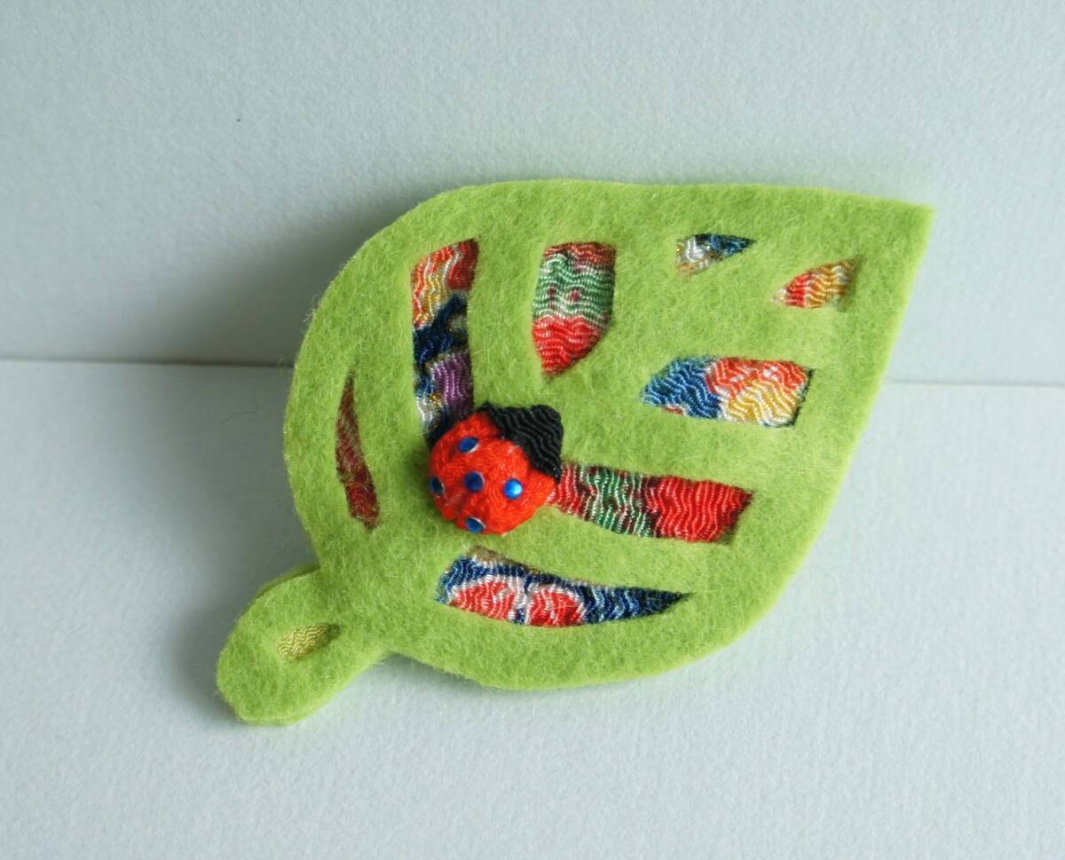 - ♪ ハンドメイド ブローチ 葉っぱ てんとうむし 切り絵風 フェルト ちりめん 高分子結晶ストーン使用