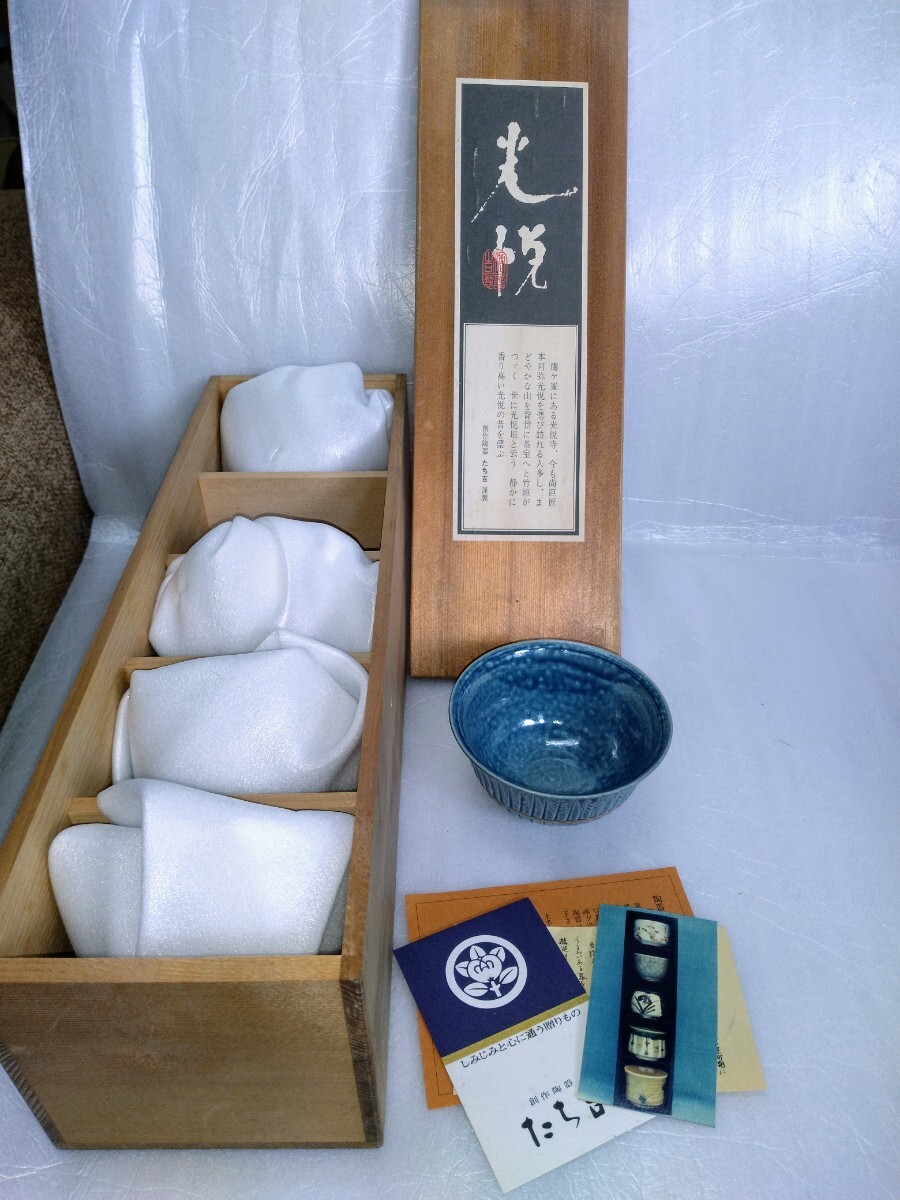 - K157 清水焼 たち吉 煎茶碗 《光悦》 5客 京焼 陶器 和食器 茶道具 湯呑 木箱 未使用保管品