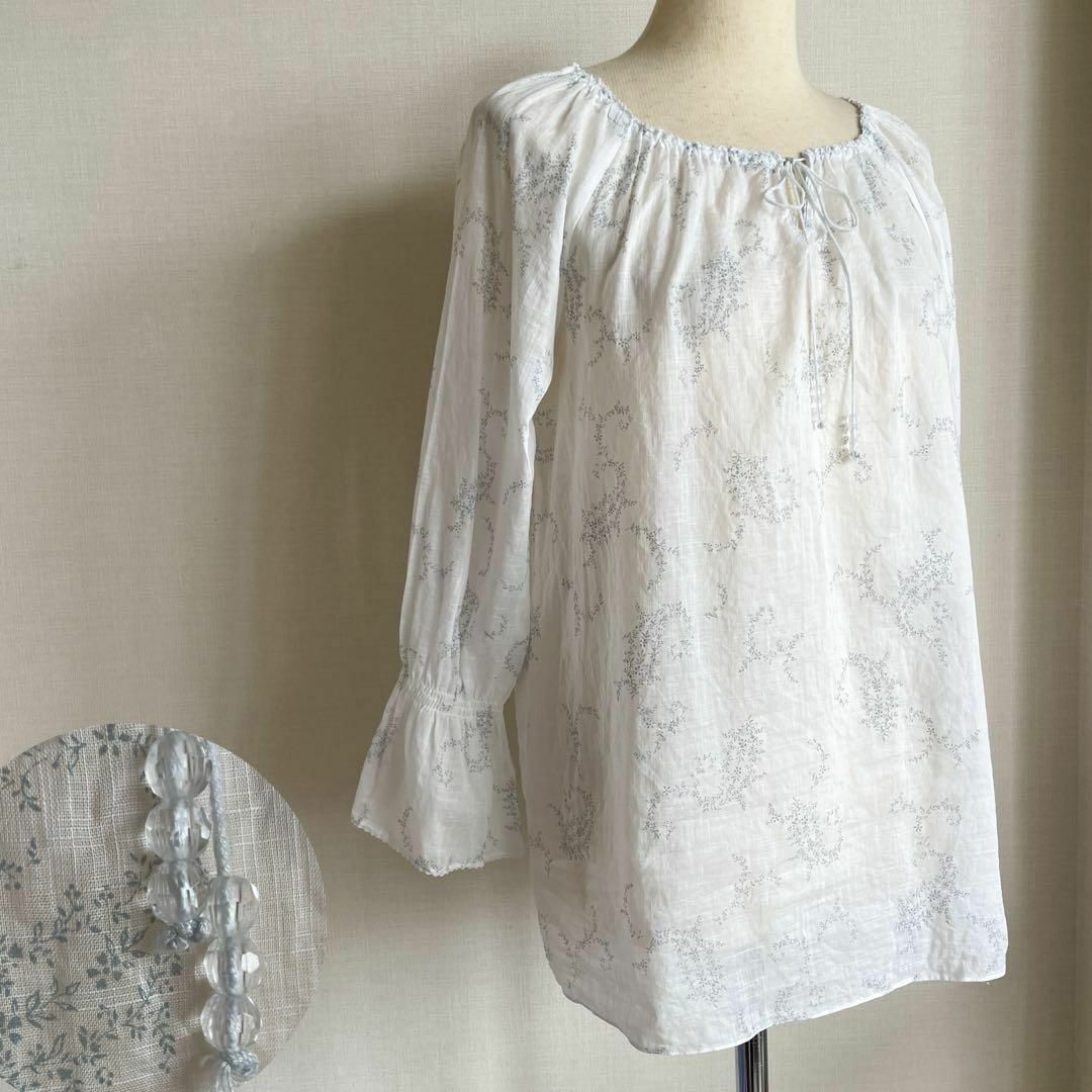 - 日本製 Lois CRAYON/ロイスクレヨン リーフプリント シアーブラウス レース ビーズリボン