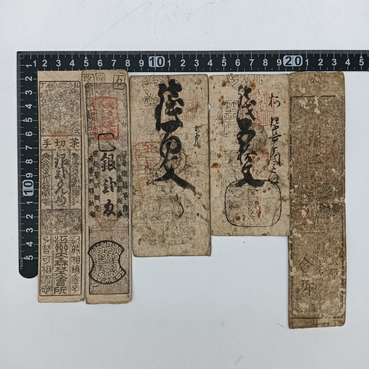 - 【A3457】江戸〜明治時代 古札 藩札 私札 朱印 貨幣 古紙幣 古文書 骨董品 アンティーク 5枚まとめ