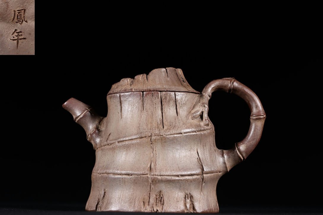 > ▼渡鶴羽▼W1993時代朱泥 倣生器竹段紫砂壺 在銘 楊鳳年 清時代/紫砂 煎茶道具 朱泥 茶壺