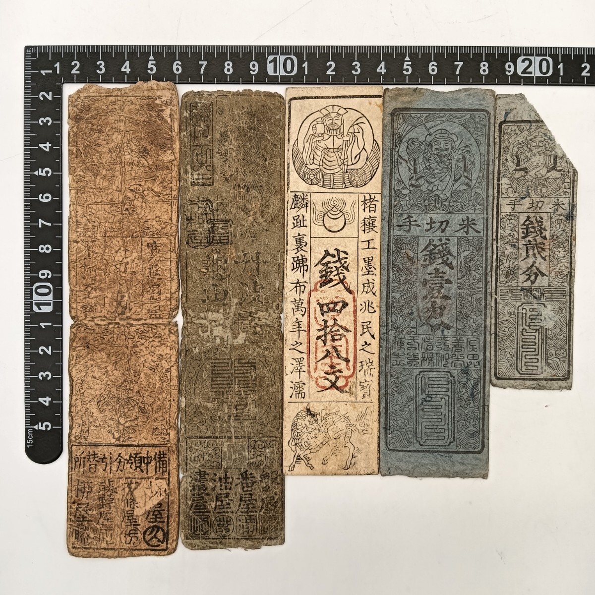 - 【A3471】江戸〜明治時代 古札 藩札 私札 青札 貨幣 古紙幣 古文書 骨董品 アンティーク 5枚まとめ