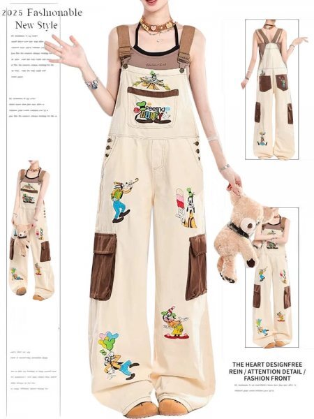 - オーバーオール ズボン S~2XLまで選べる デニム生地 ジーンズ オシャレ 刺ディズニーのキャラクタ柄 楽ちん 可愛デザイン ベージュ系