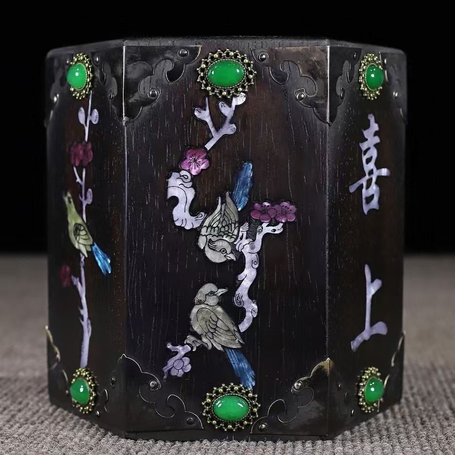 - 古木彫り 秘藏 清代 古黑檀木 嵌 貝殼 包銅嵌寶石 喜上眉梢花鳥筆筒 書道具 文房具 時代物 細密彫 置物 賞物 唐物 木彫り 文玩 6.5