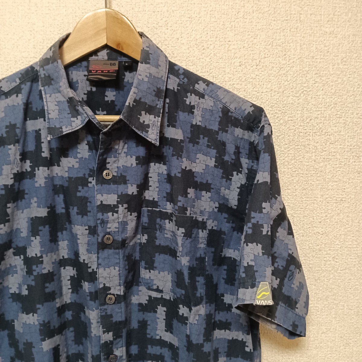 > 希少★90-00's OLD VANS 半袖 パズルピース 総柄 コットンシャツ メンズ sizeL ネイビー ヴィンテージ オールド ヴァンズ バンズ 古着 USED