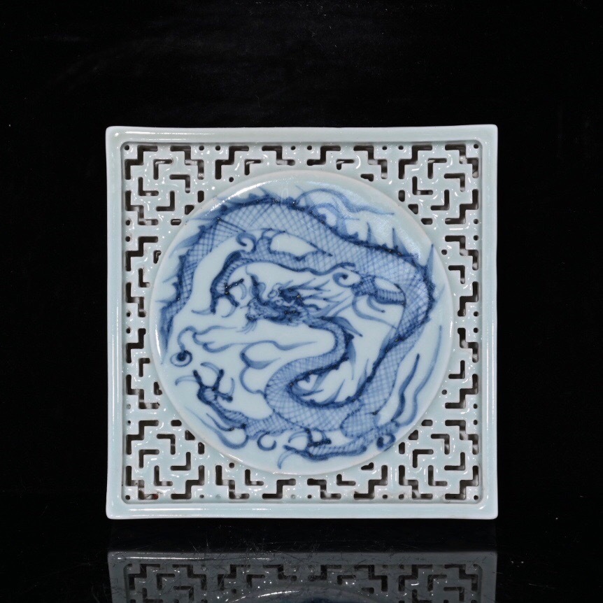 - 蔵友旧蔵出 元 青花 龍紋 鏤空四方茶盤 稀少珍品 貴重品 古陶瓷品 置物 古賞物 中国古玩 中国古美術品