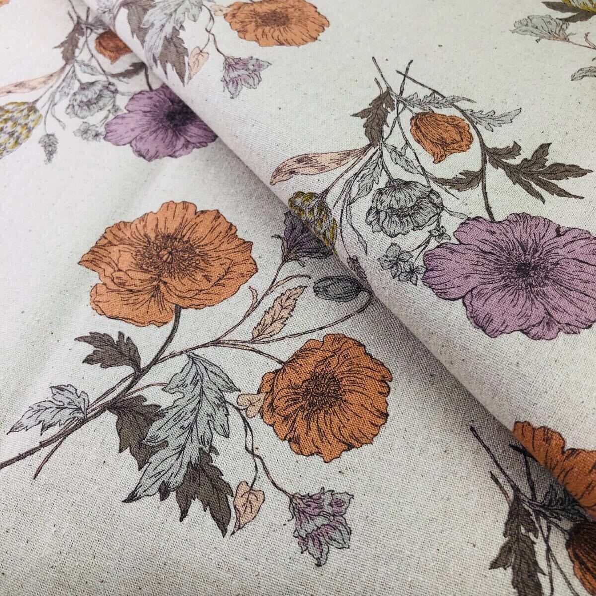 - 1m 日本製 素敵なお花柄 ボタニカル コットンリネンキャンバス 生地 はぎれ 106×100 花柄 綿麻キャンバス