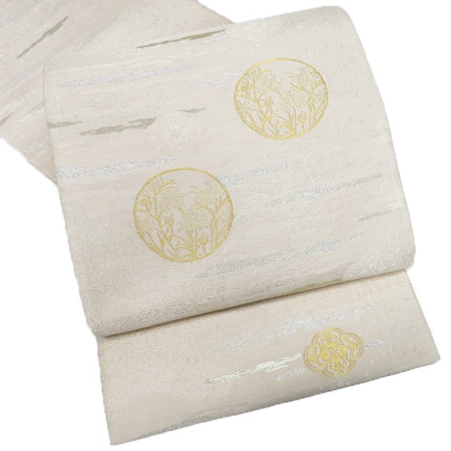 - 袋帯 未使用 正絹 フォーマル 仕立て上がり お太鼓柄 誕生花 ニゲラ 箔糸 鳥の子色 金銀 きもの北條 A1213-11