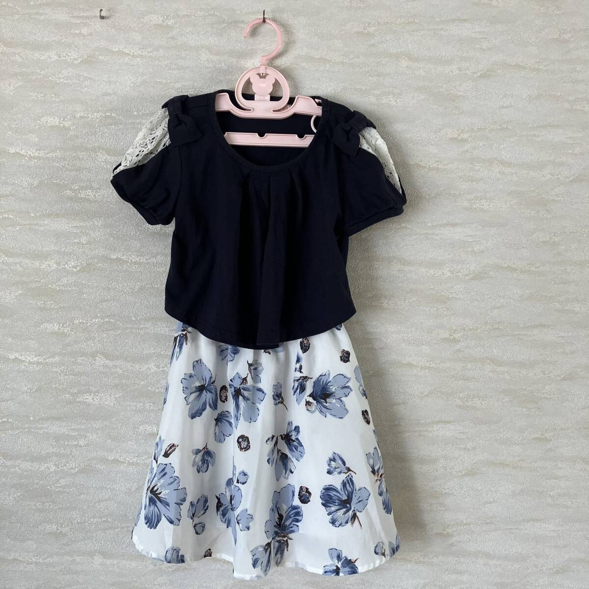 > AIRLY momo ワンピース(ネイビー×ホワイト・リボン・レース・花柄)サイズ:140