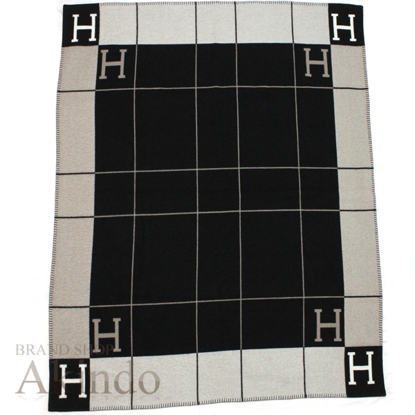 > エルメス HERMES ブランケット 毛布 プレード《アヴァロンIII》 定価30万 ブラックxグレーxホワイト 黒白 カシミア ウール