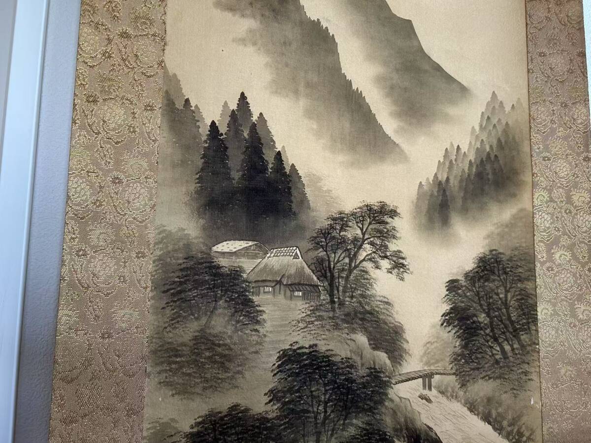 - 掛軸特集『水墨山水図』肉筆 日本画 絹本 掛軸 共箱 風鎮