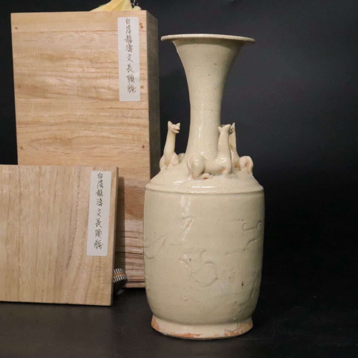 - 「 白磁 龍濤文 長頸 花瓶 」 共箱 / 中国美術 白磁 花器 壺 検索:越州窯 定窯 徳化窯 .B442