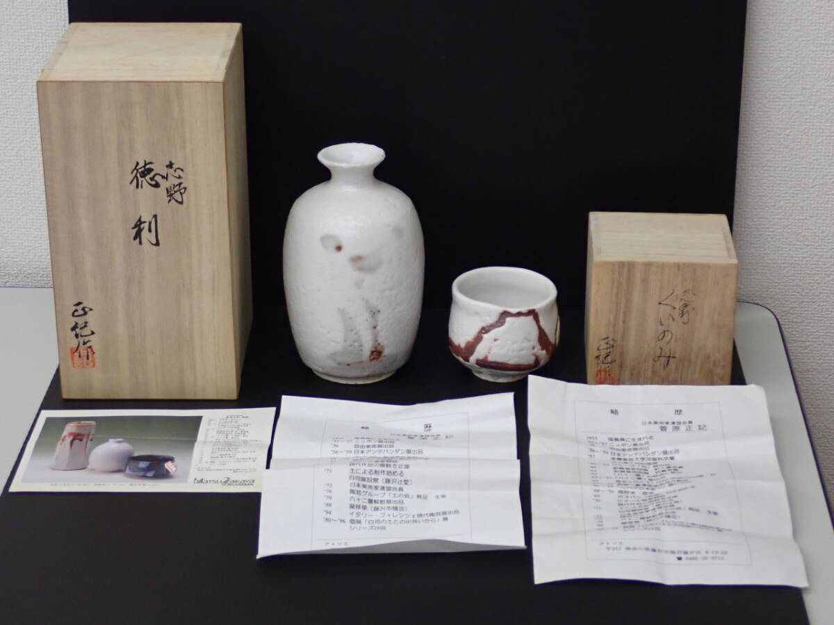 - 陶磁器-36; 菅原正記 白河 志野 徳利・ぐい呑み・酒杯・盃・酒器 共箱・略歴・はがき ★