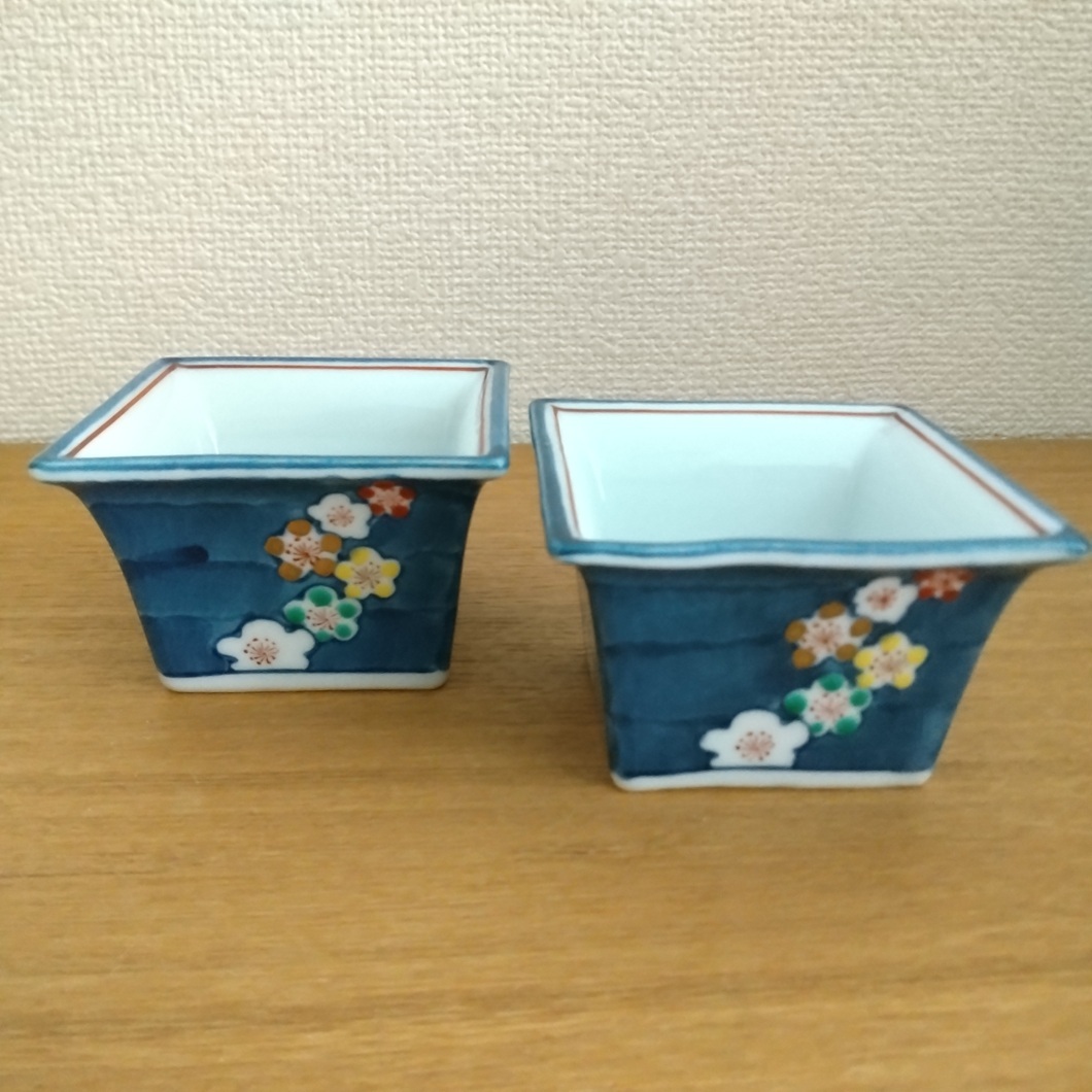 - 有田焼 貞泉窯 梅角小鉢 2客セット 手描き 金彩 赤、白、金、黄、緑 冬