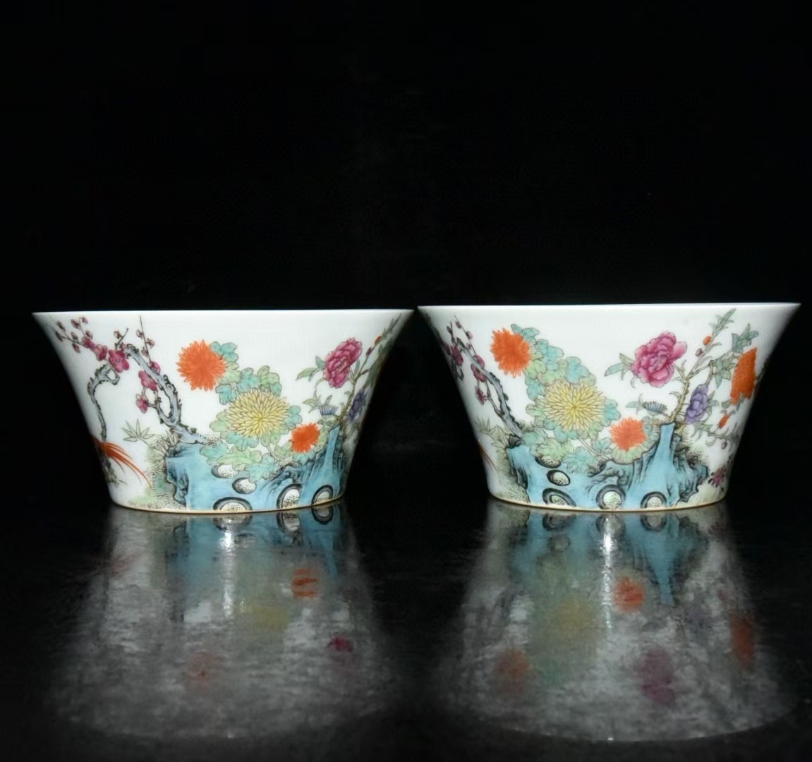 > 磁器 碗 秘藏 大清宣統年制 ピンク花鳥紋碗ペア 酒器 茶器 唐磁 染付 陶磁器 收蔵品 古美味 時代物 古美術 古置物 希少珍品 中國文玩6.23