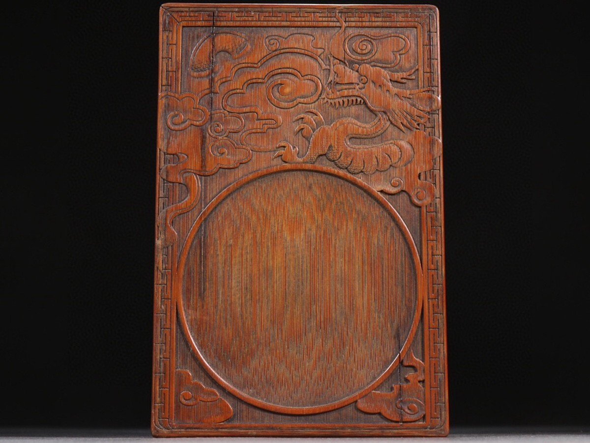 - 「清時代 老竹 彫り 雲龍紋 硯台 高士奇銘」極細工 擺件 賞物 中国古美術 旧蔵出