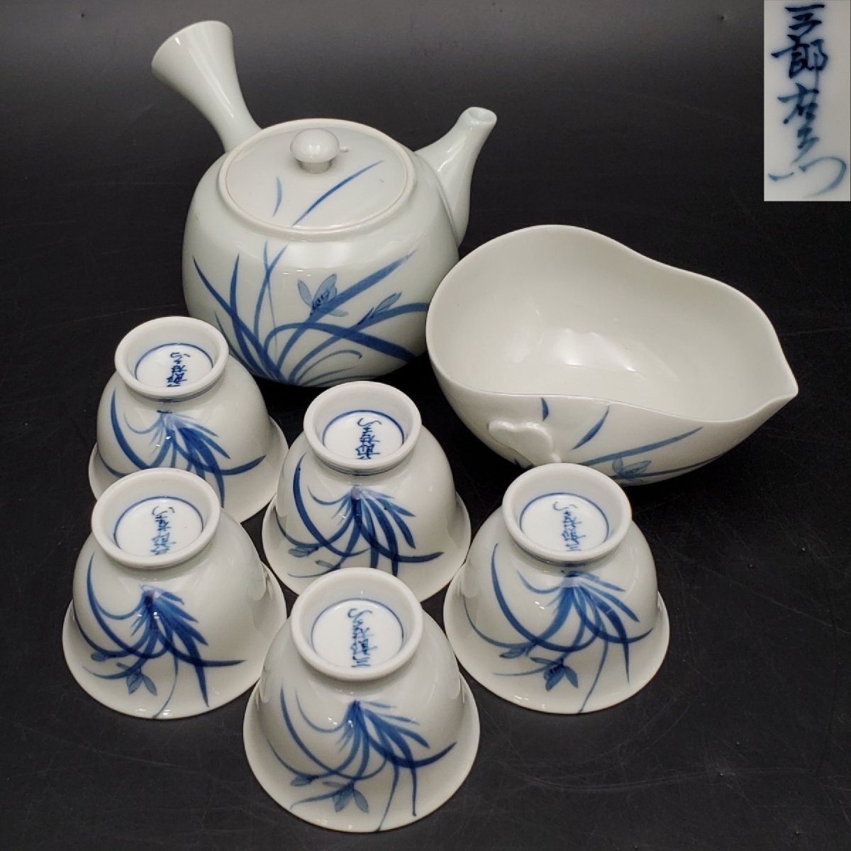 > 【宝蔵】有田焼 三郎右衛門窯 染付花文 茶器揃え 急須 湯冷まし 煎茶碗5客 煎茶道具