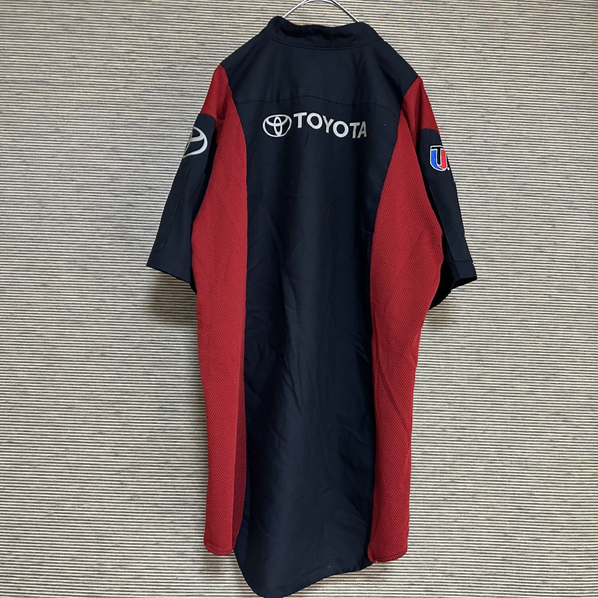 > ワークシャツ 半袖シャツ トヨタ 企業ロゴ 肩ロゴ 黒 ブラック袖ロゴ@9 古着 入手困難 激レア 希少 人気 デカロゴ ビッグロゴ