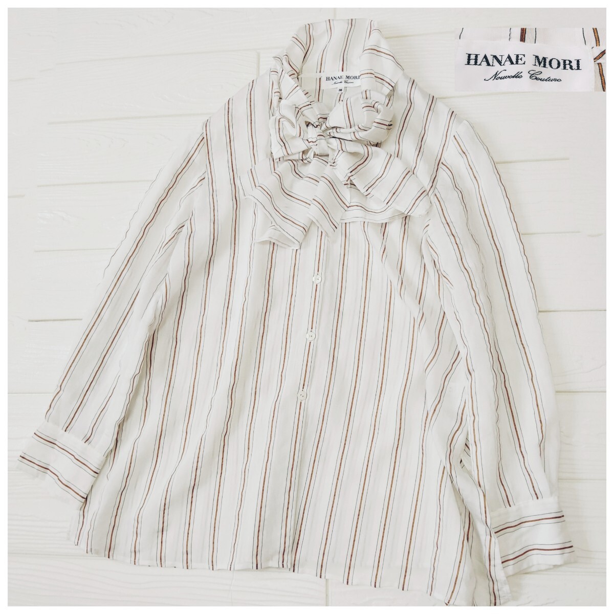 > HANAE MORI Nouvelle Couture/ハナエモリ ヌーベルクチュール*ボウタイブラウス*胸リボン*白×ストライプ*日本製*高級ライン*長袖*森英恵