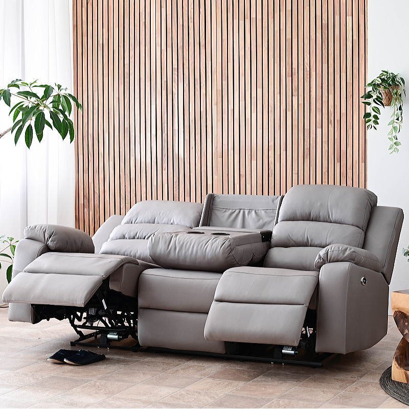 電動リクライニング3人掛けソファー レザーファブリック LGY色 OKIN社製モーター