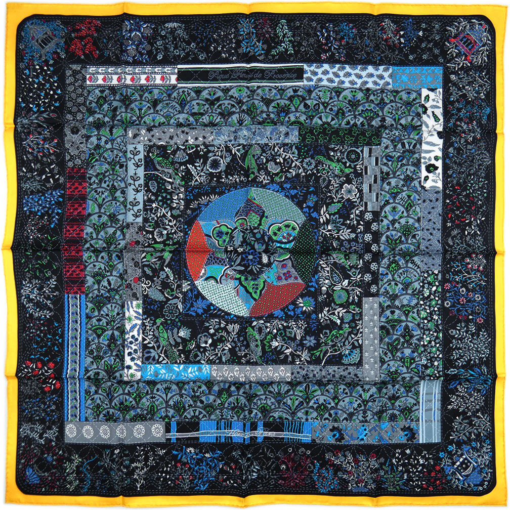 - 未使用 エルメス スカーフ HERMES カレ90 シルク 100% 90cm 90×90 大判 正方形 PIQUE FLEURI DE PROVENCE 花 植物 ブラック イエロー 黒