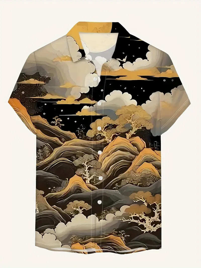 - 和柄 雲波柄 半袖シャツ アロハシャツ 321 黒 柄シャツ ヤクザ ヤンキー オラオラ系 ストリート ホスト 服 メンズ ファッション