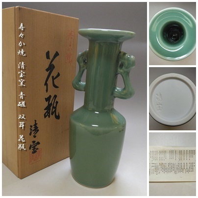 - 【T-434】寿々か焼 清宝窯 青磁 双耳 花瓶 共箱付 茶道具
