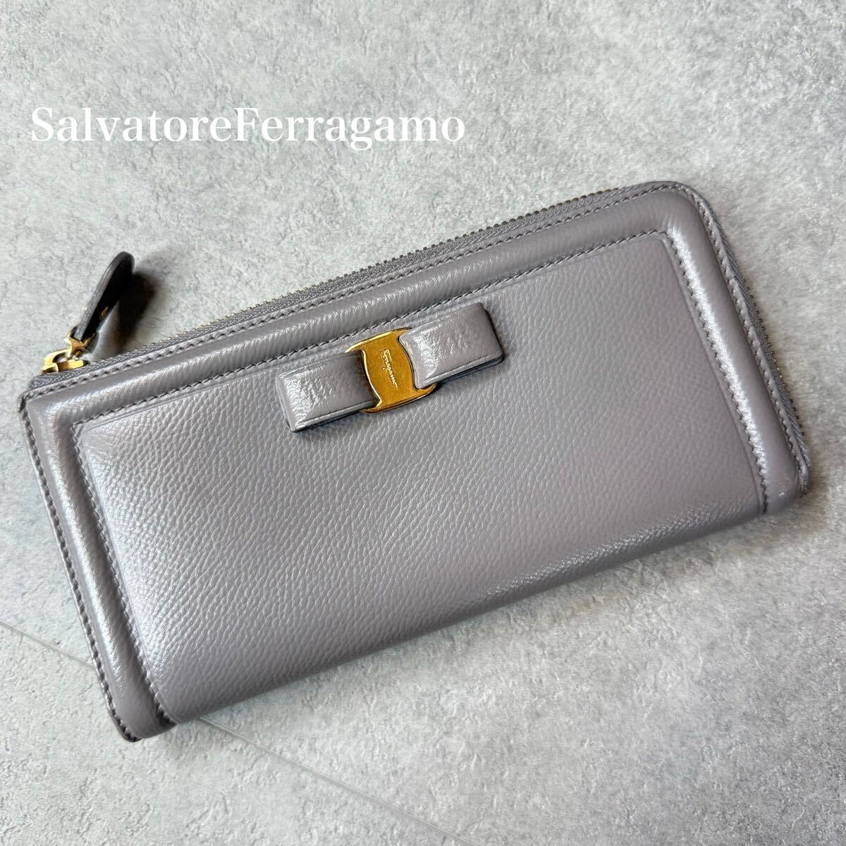 - 美品 SalvatoreFerragamo サルヴァトーレフェラガモ L字ファスナー長財布 ヴァラリボン グレー レザー ゴールド金具