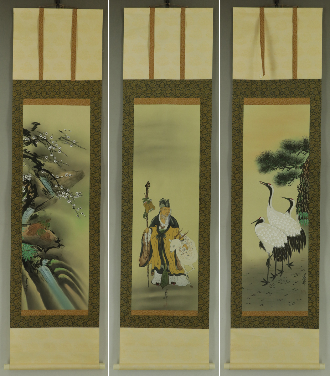 - 【肉筆】春峰銘【三対幅・慶祝図】◆絹本◆共箱◆掛軸 s05027b