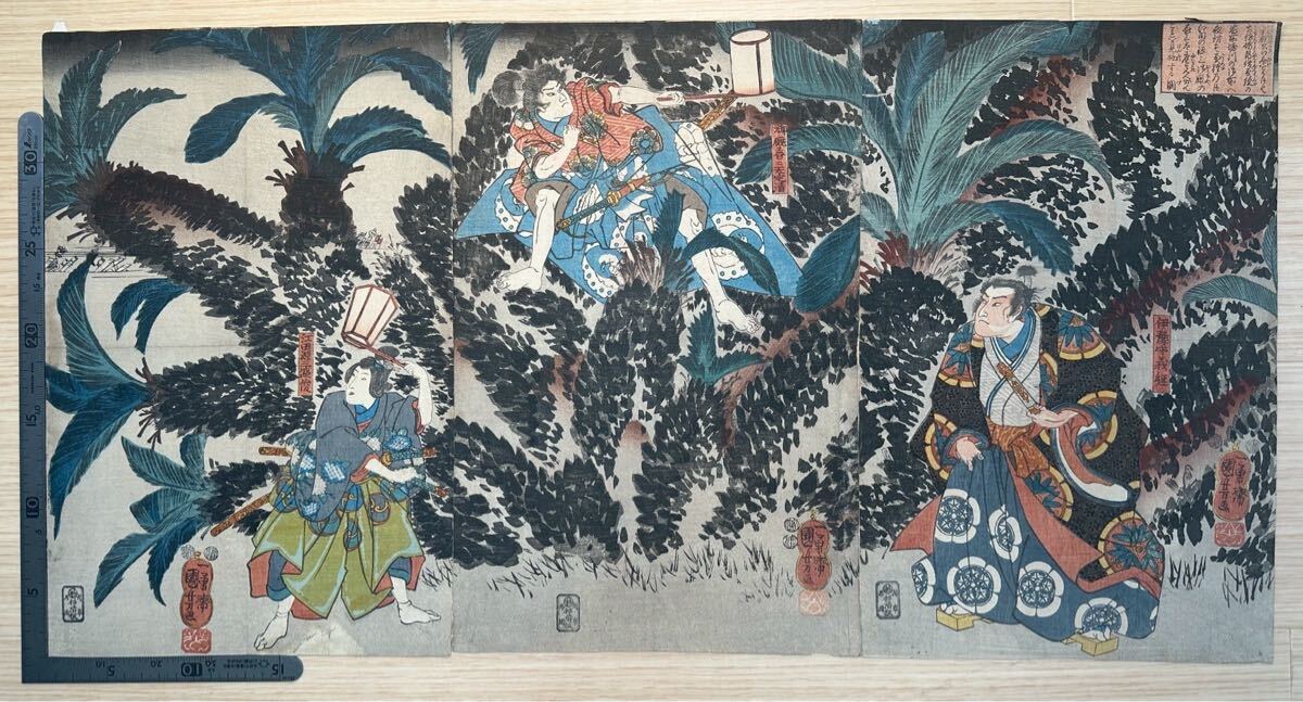 > 【真作】堀川夜討 三枚続 歌川国芳 浮世絵 ukiyo-e 木版画 中国唐物唐本 歌舞伎絵 役者絵 合戦図 武者絵 古筆古文書和本 #326