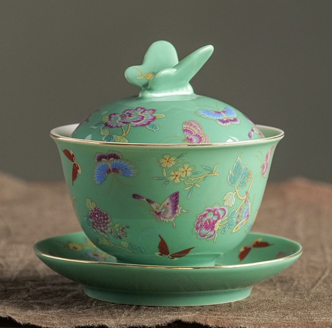 - 『蝶恋花』(グリーン)蝶と花の蓋碗(中国・京隆堂)茶器