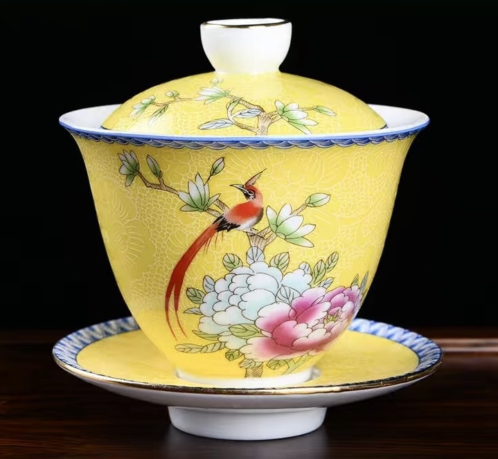 - 蓋碗「鳥語花香」帝王黄(中国茶器)磁器・琺瑯蓋碗