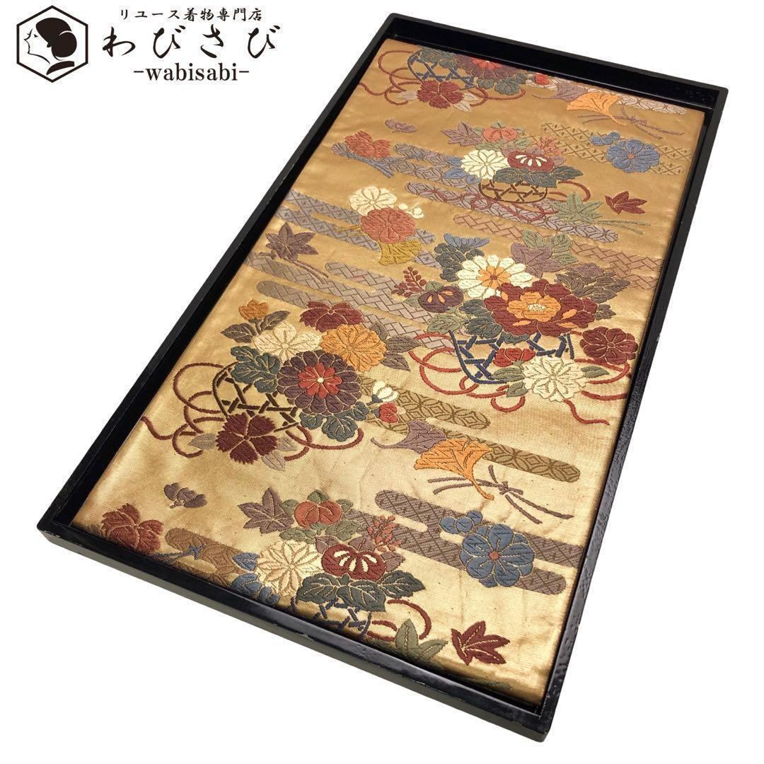 - 袋帯 唐織 エ霞に四季の花々 楓 橘 牡丹 菊 花籠 金糸 黄茶色 O-1414