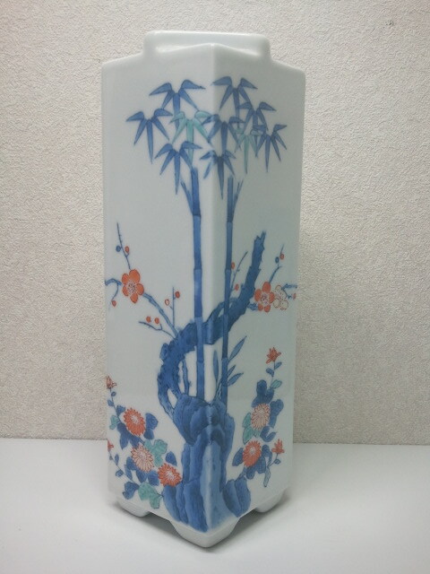> ☆r☆【美術工芸・インテリア】鍋島焼 魯山窯 角型花瓶 有田焼/花器 華器 花入れ 陶磁器 色絵 フラワーベース