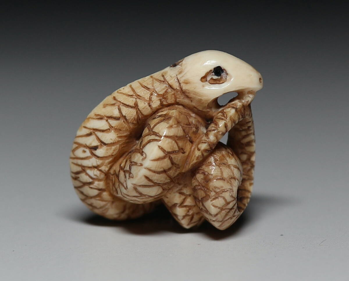- 【心】k485 根付 蛇の緒締め 見事な彫り!