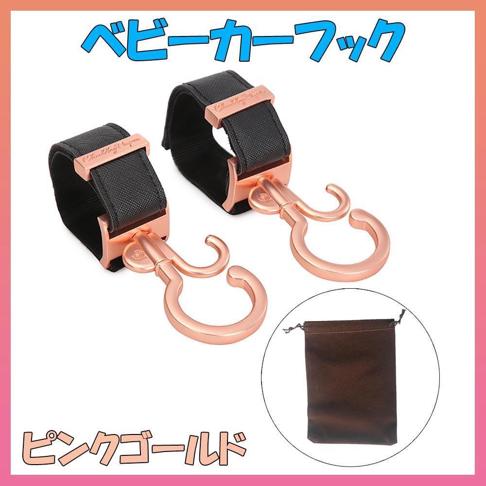 - ベビーカーフック ピンクゴールド 2個セット 荷重30kg 360度回転 収納袋付き バギーフック