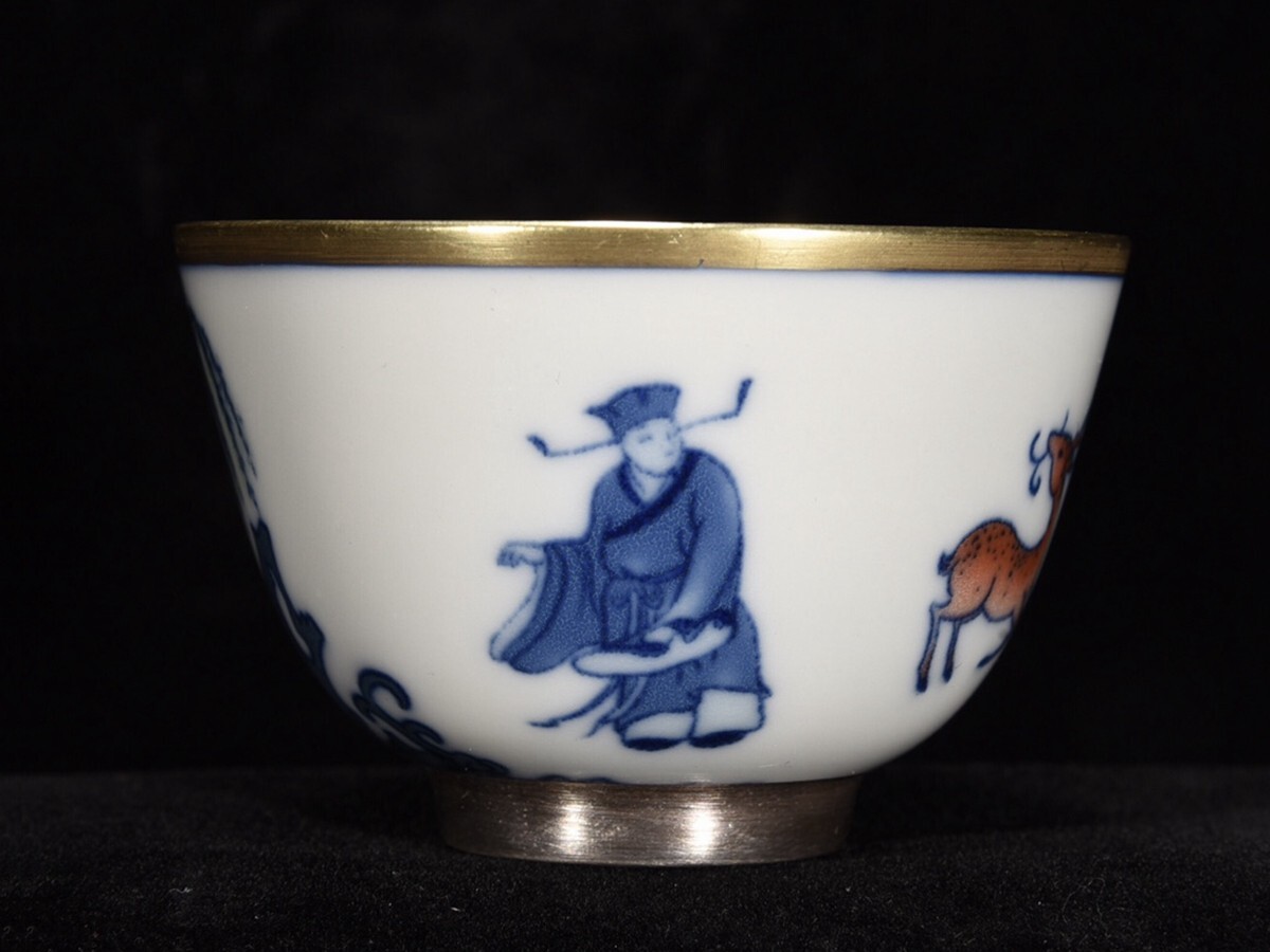 - 「清 乾隆年製 陶磁器 青花鬥彩人物故事紋 塗金杯」染付 置物 擺件 古賞物 中国古美術 旧蔵出
