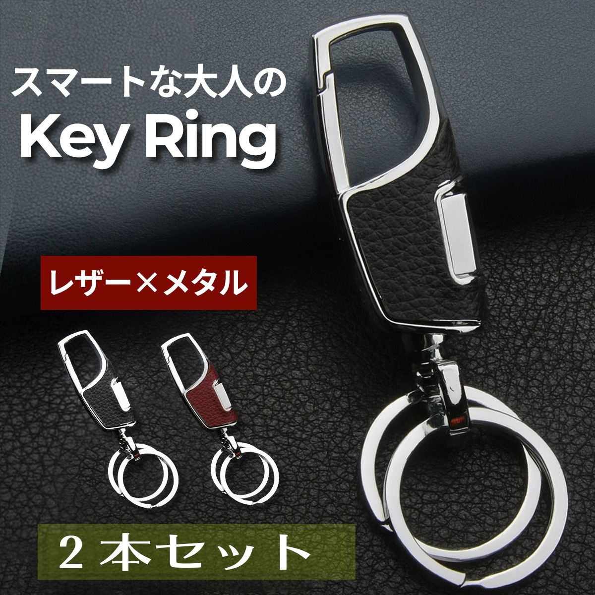 - カラビナキーリング ダブルリング キーホルダー【黒・ワインレッドの2本セット】フック ファッション デザイン メンズ