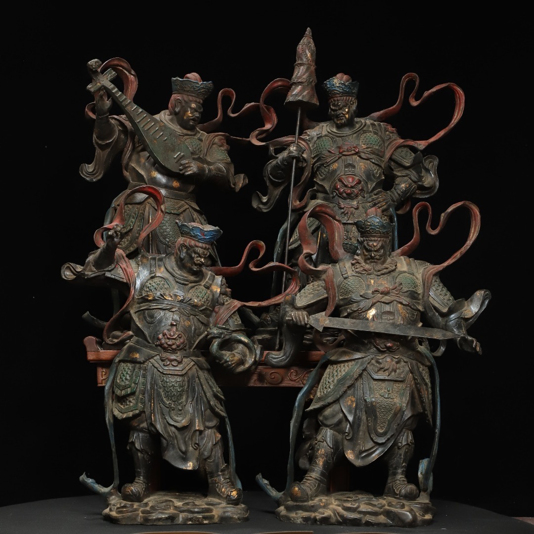 > ◆旧家蔵出◆古美術 中国古玩 明時代 古銅製 拓金 四大天王4点 仏造像 細密細工造 置物 擺件 古賞物 骨董 時代物 A01