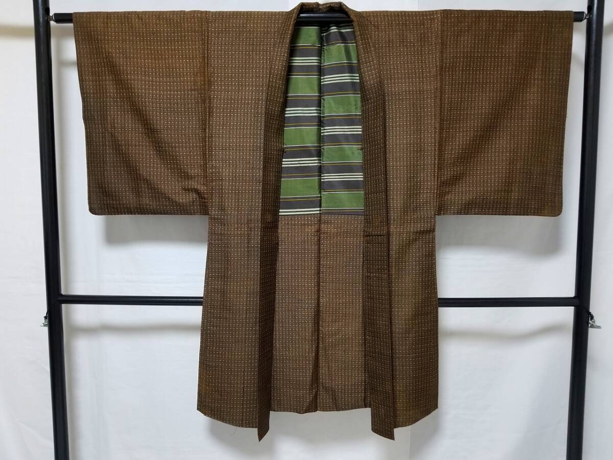 - 【桐徳】紳士物☆大島紬.羽織☆送料無料{正絹.本場奄美泥大島紬*袷仕立.羽織}*丈106-裄65*焦げ茶色地*砥粉色の変わり経緯絣.文様*№7272