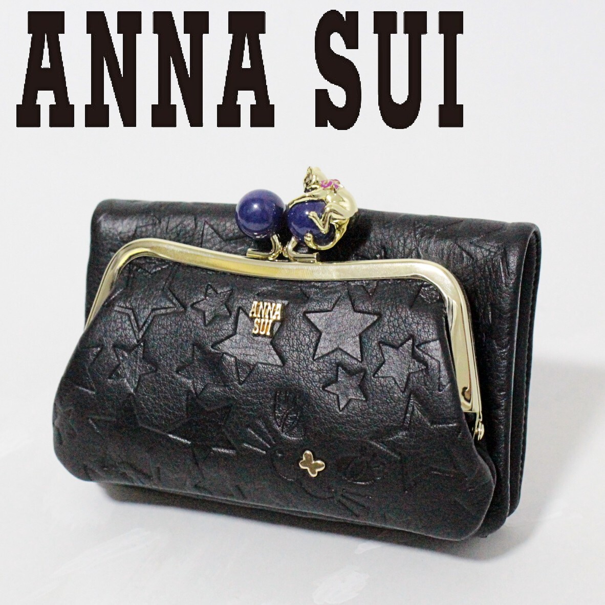- 新品 アナスイ ふっくらレザー ネコちゃんがま口小銭入れ 二つ折り財布 黒 K5288