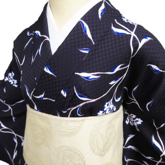 > 特選 小紋 着物 中古 正絹 袷 カジュアル 花模様 地模様 黒紅色 瑠璃色 紫色 身丈170cm 裄71cm L トール きもの北條 A1231-2