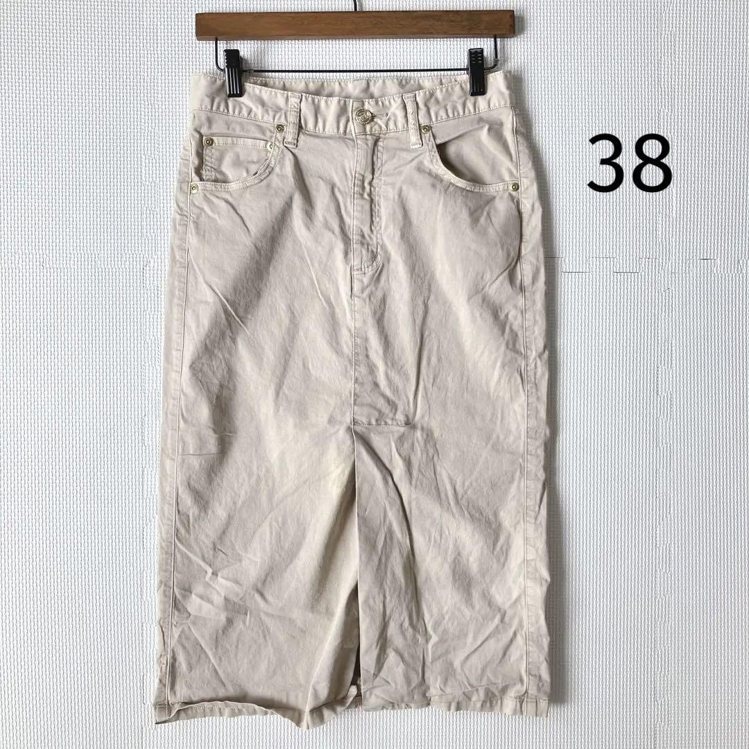 - ラクラス 膝丈タイトスカート38 ベージュ 金ボタン 薄手 夏 フロントスリット