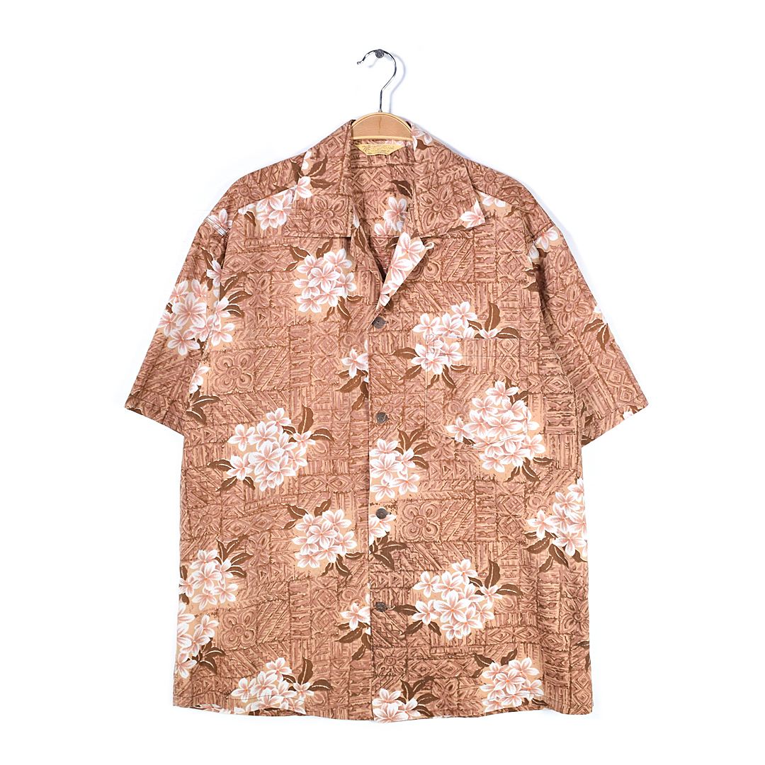 > 【送料無料】50s ALII LOLE ココナッツボタン ヴィンテージアロハシャツ 開襟 オープンカラーシャツ 花柄 ブラウン ハワイ製 L @CCD1194