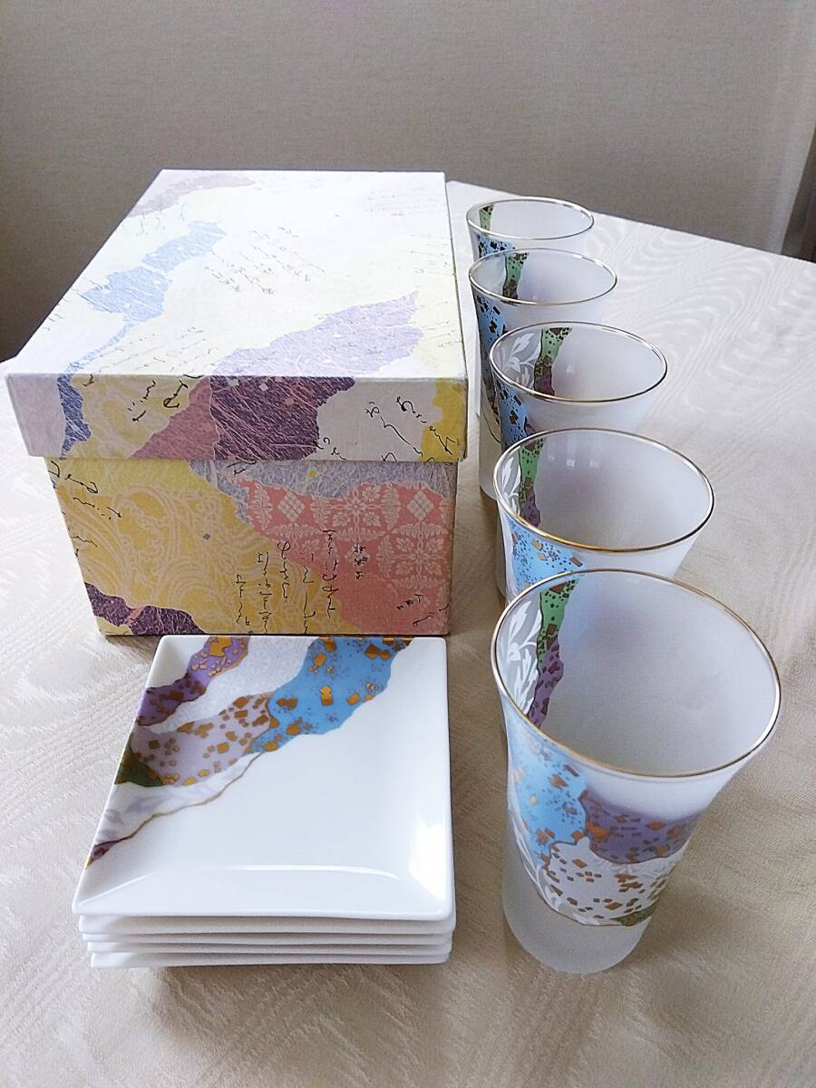 - 新品 美品 陶彩 ちぎり絵 一口ビール 冷酒グラス 小皿 ビールグラスセット 5組 銘々皿